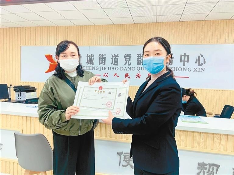 工作人员为马女士颁发营业执照。