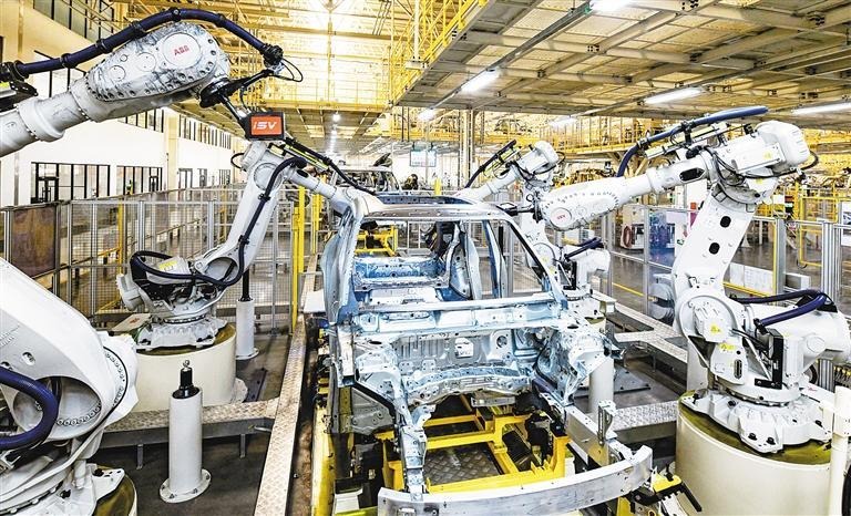 吉利汽车西安制造基地,智能焊接机器人流水线作业。