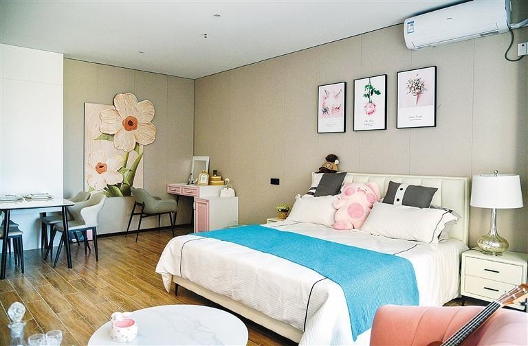 进入项目内部,记者看到,这里的房间均为精装修,大飘窗是每个房间的标配,户内沙发、茶几、书桌、空调、冰箱、洗衣机、热水器等全套生活家具家电一应俱全,能够保证租户“拎包入住”。