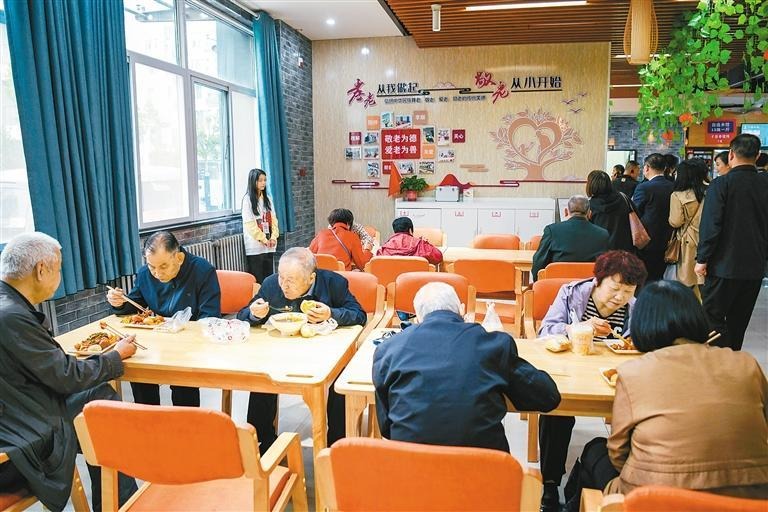 老人们在高陵区水景社区(西安工商学院)“高·幸食堂”就餐。