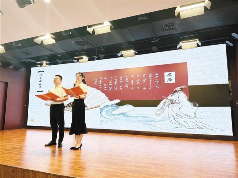 随后,大家共同传诵道德经典,聆听了屈原的爱国故事,欣赏了《离骚》节选和《满江红·怒发冲冠》的诵读表演。诗朗诵《诗训端然继家风》和视频《中国家风——梁启超和他的九个儿女》,再现了中华民族优良的家风家训,也给大家上了生动的一课。