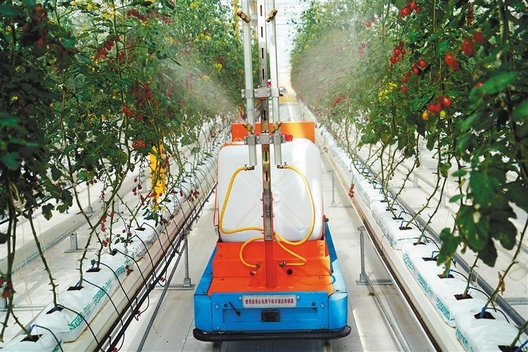 在番茄谷创新协同基地的智能化温室里,智能巡检机器人和喷雾机器人在各自的轨道上有序忙碌着。“只要设置好程序,智能巡检机器人就会自动工作,巡检过程中遇见障碍会自动停车。” 智能化温室技术员訾永福说,智能巡检机器人会将番茄的生长情况以及病虫害情况反馈到电子屏幕上,以便工人及时处理,有效提高了番茄的生产效率和产品质量。