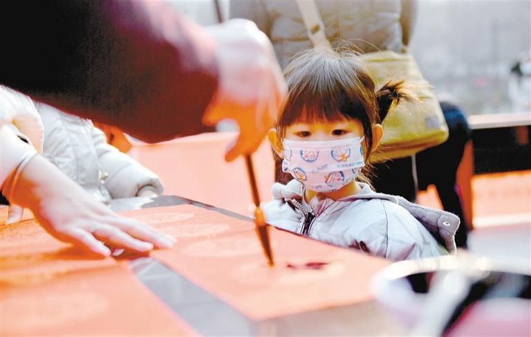 书法志愿者现场挥毫泼墨,为市民群众写春联、送祝福。