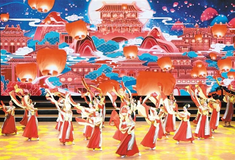6月27日,老年学员表演舞蹈《盛唐乐》。当日,为庆祝中国共产党成立102周年,由中共西安市委老干部工作局指导,西安老年大学主办的“永远跟党走 奋进新征程”西安老年大学第四届艺术节在铁路文化宫启幕,来自西安老年大学各专业院系、艺术团队和部分社会老年团队的老年学员们,用舞蹈、太极、声乐、器乐、朗诵、模特和书画等丰富多彩的形式,在展现老年学员老有所学、老有所乐、老有所为的精神风貌的同时,也为现场观众带来一场精彩纷呈的文化视听盛宴。