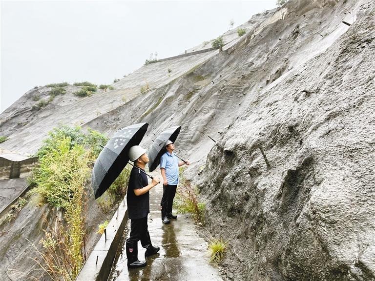 金盆水库工作人员对坝体、高边坡等重点部位进行巡查。