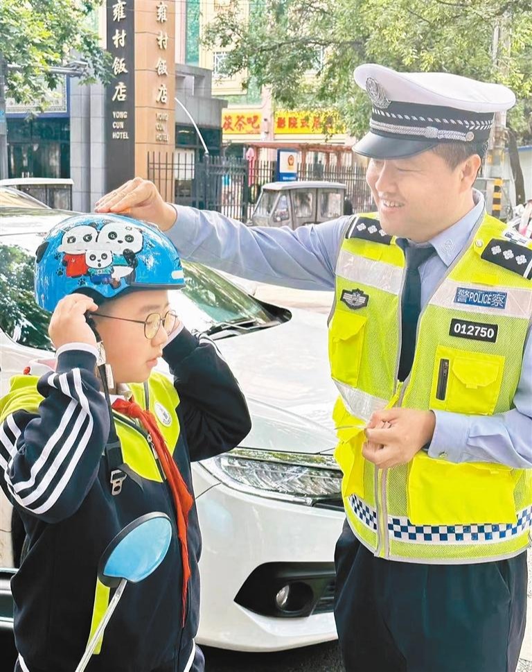 5月22日,碑林交警东大街中队联合碑林区建国路小学共同启动“送你一朵小红花” 护学活动,为按规定佩戴安全头盔的学生和家长分别赠送并粘贴主题贴纸。