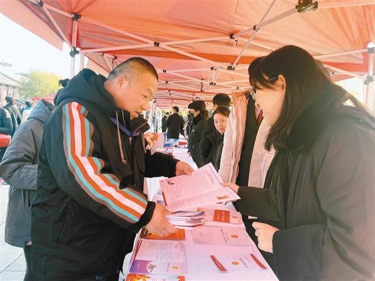 工作人员向市民发放普法宣传册。