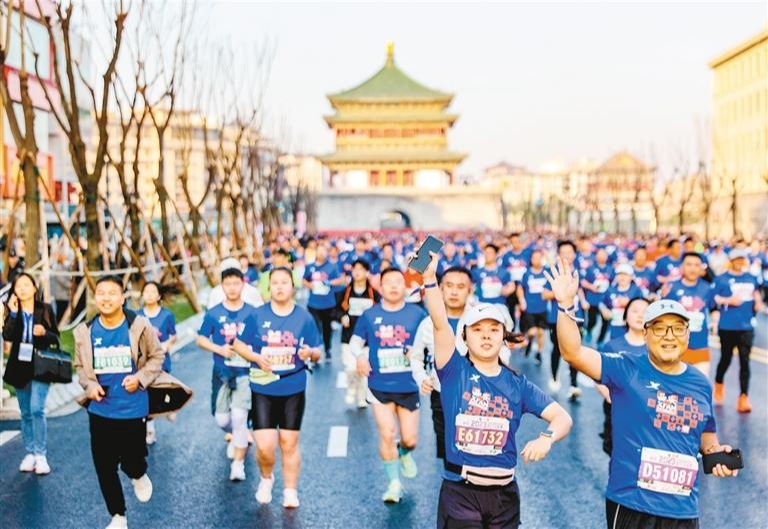 2023年西安马拉松赛比赛现场,选手们一路畅跑。