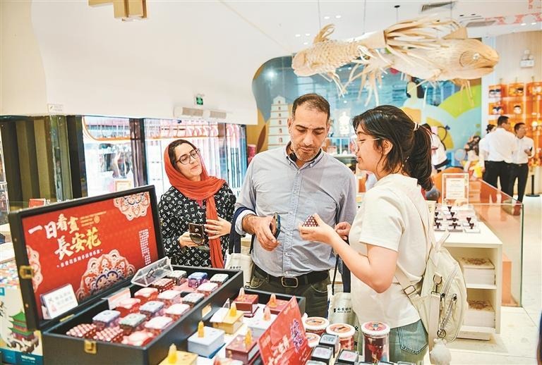 大唐不夜城步行街周边文创商店里,琳琅满目的纪念品深深吸引了大家的目光。来自美国的国际教师格雷格熟练地掏出手机,使用微信扫码的方式付款购买了一款文创产品。来中国不到一年,他已经喜欢上这种便利的支付方式。