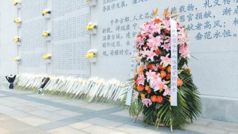 图为活动参与者敬献的花篮与菊花,表达对捐献者的敬意和对生命的礼赞。