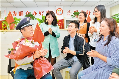 在西安市文广新局离退休人员服务中心,市委文明办工作人员向第四届西安市道德模范李天真献上了鲜花和节日的祝福。今年56岁的李天真是市文广新局离退休人员服务中心党总支书记、主任,从几年前退休后她就挑起了因文化体制改革移交到中心的1500名离退休人员的重担。“就在一天前,我们召开了‘庆祝新中国成立70周年我和祖国共成长’座谈会,邀请了离休老干部、1949年从艺和1949年出生的老党员们大家欢聚一堂,共诉祖国发展变化,为祖国的繁荣昌盛感到自豪。”