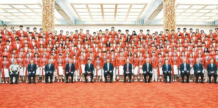8月20日,党和国家领导人习近平、赵乐际、王沪宁、蔡奇、李希、韩正等在人民大会堂接见第33届夏季奥林匹克运动会中国体育代表团全体成员。