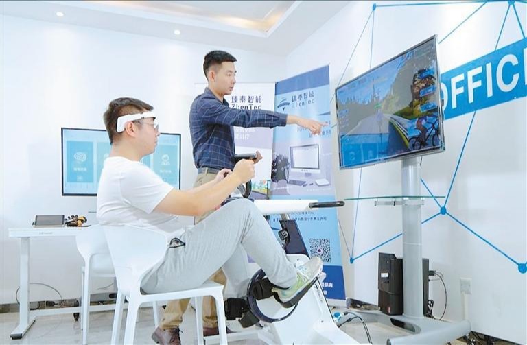 臻泰智能科技研发的脑机接口上下肢康复机器人使用场景。