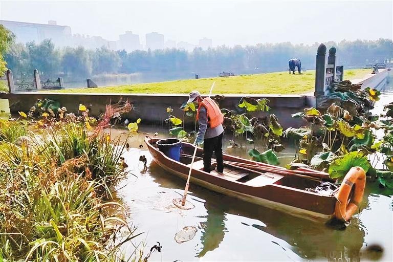 工作人员清理湖面漂浮物。