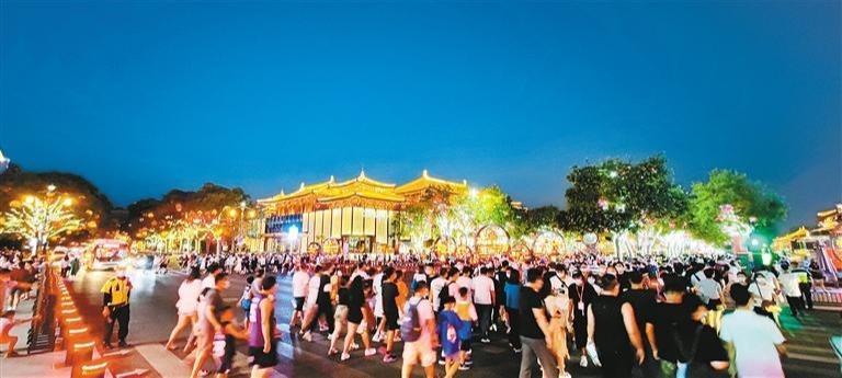 “长沙的夜生活很热闹,我们来了西安后发现这里也是一样啊,能去玩儿去逛的地方太多了。”上周,长沙的吴先生带家人来玩,选择住在了大雁塔附近。第一站自然是人气最旺的大唐不夜城,步行街上如织的人流好不热闹。从唐朝“穿越”而来的“房玄龄”“杜如晦”两位贤相,以诙谐幽默的方式与游客互动,让大家直呼这种方式真过瘾。晚上9点,长安十二时辰主题街区里,当一回“唐潮人”的小姐姐们,穿着汉服在沉浸式体验盛唐市井文化的梦幻之旅。街区创新打造的“大唐制造”街面商业体系,让夜晚显得无比生动璀璨。