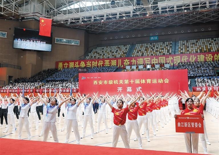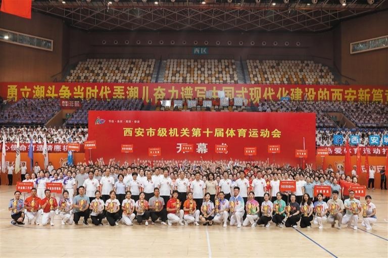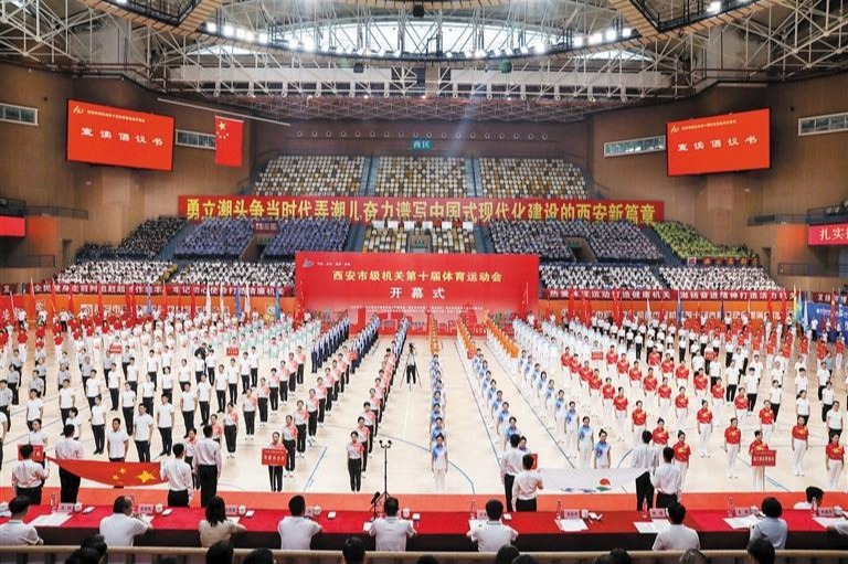 6月28日,市级机关第十届体育运动会开幕式暨“安居杯”广播体操决赛展演在西安城市运动公园体育馆隆重举行。市级机关“十运会”组委会成员,市级机关各部门、西咸新区和各开发区管委会、市属高校等单位相关领导,机关各单位党员干部代表3000余人参加开幕式。