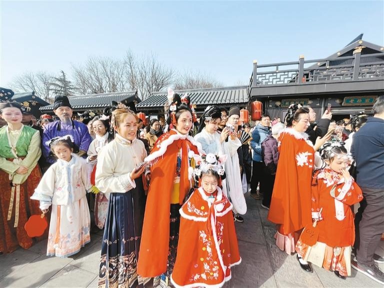 国潮复兴令汉服在大众能够有限使用的场景里开始破圈,逛街、吃饭、会友、游玩、拜年、结婚……很多场合都有汉服的身影。而汉服体验,已然成为西安文旅产业流水线吸引客流、文旅融合的载体。某景区汉服体验馆负责人告诉记者,今年总台春晚西安分会场和其他节目对汉服文化的普及效应、引流作用出人意料,将汉服爱好者的范围扩大了数倍。“龙年刚启程,赶潮流的人就几乎爆了,从大年初一到现在,我们的化妆师几乎没有轮休过,最晚要工作到晚上十点才能收工,很多人一进门就指定要求做春晚上《年锦》里的刘诗诗的发饰造型,有人指定要做东仓鼓乐里唐代仕女的造型。汉服童装、亲子装也很受追捧,有的游客拍照之后很喜欢某一套衣服就直接买回去作纪念。”