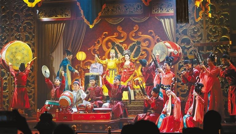 户外免费演出部分是东仓鼓乐正宗传统曲目专场。《满庭芳》《霸王鞭》《五色鸟》……均是当年流转宫廷大殿里大宴宾朋的佳作,每一场都有千人之众,观众们里三层外三层围得水泄不通,更期待与演员们的互动。传承人齐与峰自豪地感慨:“当年奏响这些曲调的乐工,最多时数百人,最少时也有百余人,唐代宫廷乐队之庞大之先进无可匹敌。祖先们创造的音符和表演形式在当时领先世界。”