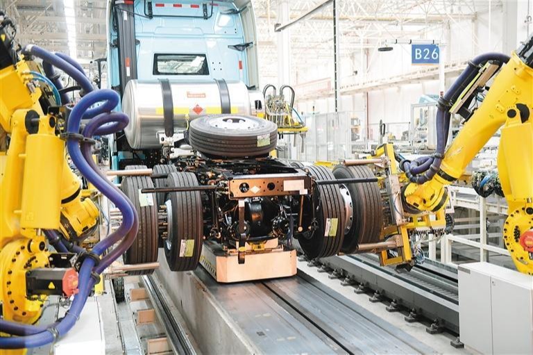 陕汽新能源重卡生产基地汽车总装配线,工业机器人正在进行汽车轮胎自动化装配作业。(资料图片)