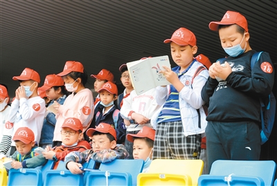 随后,200名小记者被分成8组鱼贯进入西安奥体中心体育场,伴随着一声声赞叹和兴奋的欢呼,孩子们迎来了场馆宣讲员。当得知这座能容纳6万余人的现代化体育场的总体设计立意,来源于古今丝路的历史和石榴花的祈愿时,不少小记者不禁频频点头。当宣讲员告诉大家,今年9月15日举行的十四运会开幕式以及之后的全运会田径比赛就将在这里上演,而且,这座体育场是国内首个实现5G全覆盖的智慧体育场时,孩子们又发出了一片欢呼声。