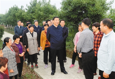 座谈会前,习近平于十三日在南阳市淅川县九重镇邹庄村考察利用南水北调移民村产业发展资金建立起来的丹江绿色果蔬园基地,同村民亲切交流。