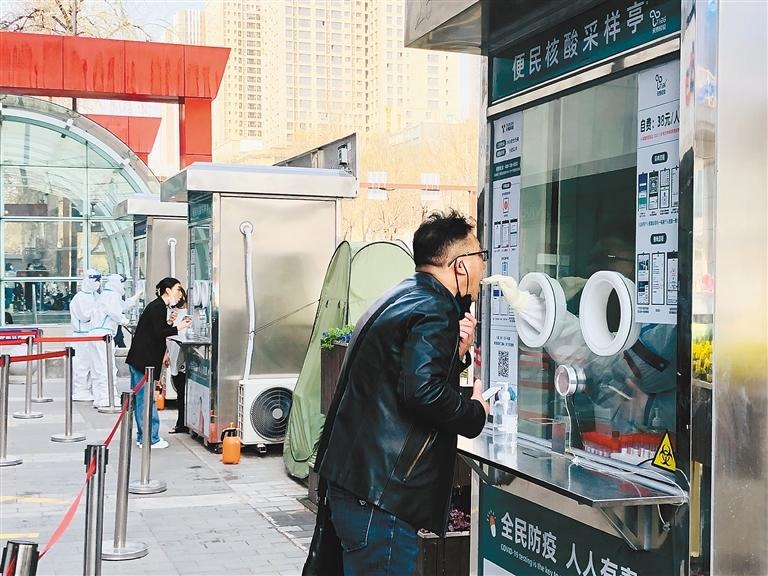 3月8日,在小寨天桥西北角,市民正在排队进行核酸检测。据了解,此处设立的4个便民核酸采样亭近期向市民提供24小时免费核酸检测服务。