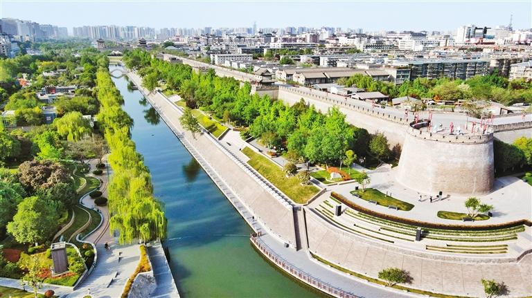 4月9日,古城天气晴朗,环城公园树木茂盛,春意盎然,护城河清水长流、碧带环郭。