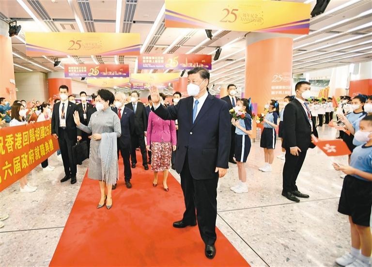 习近平强调,行而不辍,未来可期。只要毫不动摇坚持“一国两制”,香港的未来一定会更加美好,香港一定能为中华民族伟大复兴作出新的更大贡献。中共中央政治局委员、中央书记处书记、中央办公厅主任丁薛祥,中共中央政治局委员、中央军委副主席许其亮,全国人大常委会副委员长沈跃跃,国务委员兼外交部长王毅,全国政协副主席、国务院港澳事务办公室主任夏宝龙等陪同人员一同抵达。