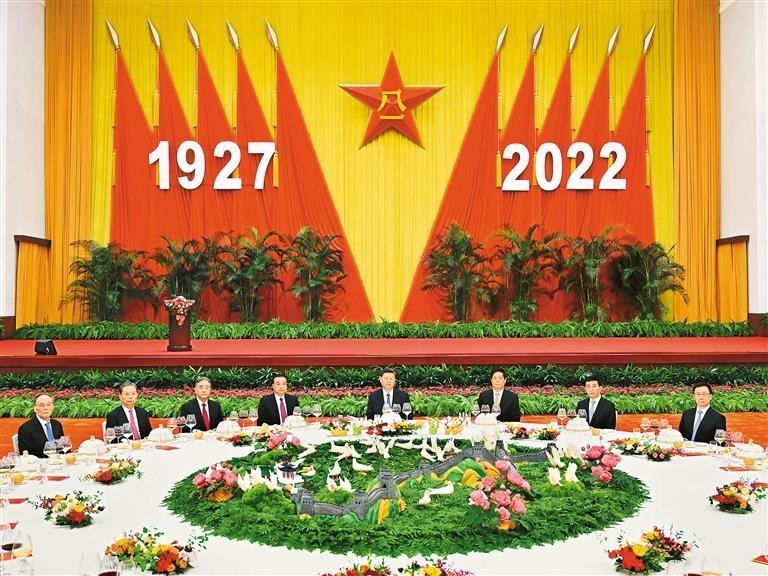 7月31日,中华人民共和国国防部在北京人民大会堂举行盛大招待会,热烈庆祝中国人民解放军建军95周年。中共中央总书记、国家主席、中央军委主席习近平和李克强、栗战书、汪洋、王沪宁、赵乐际、韩正、王岐山等党和国家领导人出席招待会。