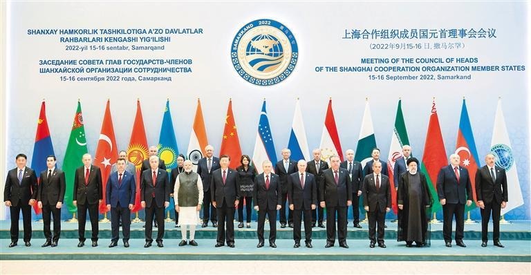 当地时间9月16日,国家主席习近平在撒马尔罕国际会议中心出席上海合作组织成员国元首理事会第二十二次会议并发表重要讲话。这是大范围会谈前,与会各方集体合影。