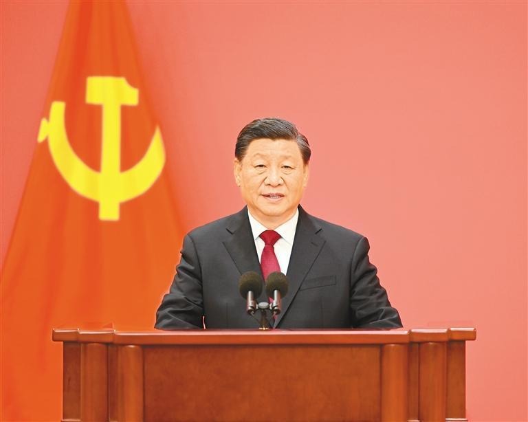 10月23日,刚刚在中国共产党第二十届中央委员会第一次全体会议上当选的中共中央总书记习近平和中共中央政治局常委李强、赵乐际、王沪宁、蔡奇、丁薛祥、李希在北京人民大会堂同采访中共二十大的中外记者亲切见面。这是习近平发表重要讲话。