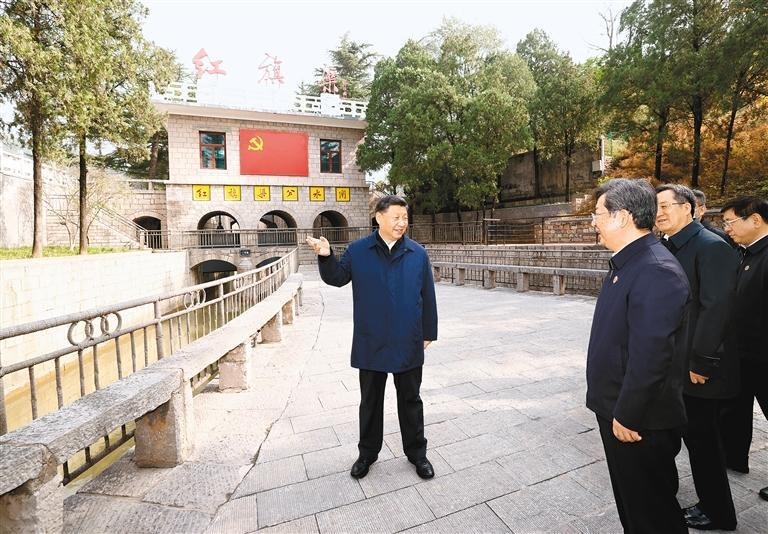 28日上午,习近平来到河南安阳林州市红旗渠纪念馆。上世纪60年代,当地人民为解决靠天等雨的恶劣生存环境,在党和政府支持下,在太行山腰修建了引漳入林水利工程,被称为“人工天河”。习近平走进展馆,依次参观了“千年旱魔,世代抗争”、“红旗引领,创造奇迹”、“英雄人民,太行丰碑”、“山河巨变,实现梦想”、“继往开来,精神永恒”等展览内容。习近平指出,红旗渠就是纪念碑,记载了林县人不认命、不服输、敢于战天斗地的英雄气概。要用红旗渠精神教育人民特别是广大青少年,社会主义是拼出来、干出来、拿命换来的,不仅过去如此,新时代也是如此。没有老一辈人拼命地干,没有他们付出的鲜血乃至生命,就没有今天的幸福生活,我们要永远铭记他们。今天,物质生活大为改善,但愚公移山、艰苦奋斗的精神不能变。红旗渠很有教育意义,大家都应该来看看。随后,习近平实地察看红旗渠分水闸运行情况,详细了解分水闸在调水、灌溉、改善生态环境等方面的重要作用。