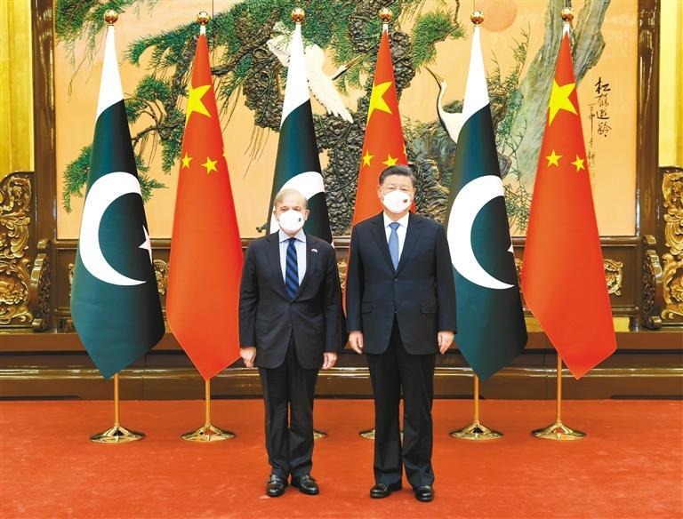 习近平介绍了中国共产党第二十次全国代表大会取得的重要成果。习近平指出,中国将继续坚持对外开放基本国策,不断以中国新发展为包括巴基斯坦在内的世界各国提供新机遇。中方愿同巴方深化发展战略对接。双方要用好中巴经济走廊联合合作委员会机制,以更高效率推进中巴经济走廊建设,将其打造成“一带一路”高质量发展示范性工程。要加快推进瓜达尔港配套基础设施建设,发挥港口对地区联通发展的辐射带动作用。双方要共同努力,为早日实施一号铁路干线升级改造项目和卡拉奇环城铁路项目创造条件。中方欢迎巴基斯坦扩大优质农产品对华出口,愿同巴方拓展数字经济、电子商务、光伏等新能源合作,扎实推进农业、科技、民生等领域合作,将继续为巴方稳定金融形势提供力所能及的支持。中方支持中国工业强省同巴方结对子推进产业合作,希望巴方提供良好营商环境。我高度牵挂在巴中国人的安全问题,希望巴方为赴巴基斯坦开展合作的中国机构和人员提供可靠安全环境。