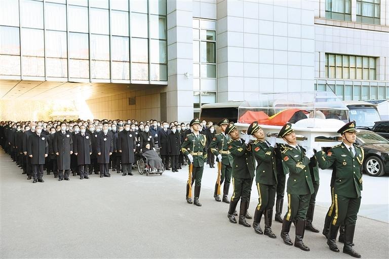 12月5日,江泽民同志的遗体在北京火化。这是习近平、李克强、栗战书、汪洋、李强、赵乐际、王沪宁、韩正、蔡奇、丁薛祥、李希、王岐山、胡锦涛等到中国人民解放军总医院为江泽民同志送别,护送江泽民同志的遗体上灵车。