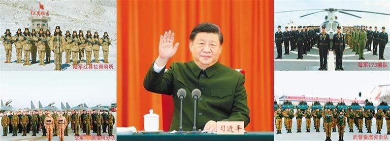 习近平同新疆军区红其拉甫边防连执勤哨所、海军173编队、空军航空兵某旅值班分队、武警猎鹰突击队进行视频通话(拼版照片)。