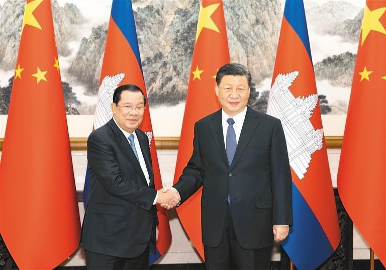 习近平强调,中方坚定支持柬埔寨人民自主选择符合本国国情的发展道路,坚定支持柬埔寨维护国家主权和安全,坚定支持柬埔寨平稳推进国内重大政治议程和经济社会发展,坚决反对外部势力干涉柬埔寨内政。中方把柬埔寨作为周边外交重点方向,始终从全局和战略高度规划和推进中柬各领域合作,愿在以中国式现代化全面推进中华民族伟大复兴进程中,同柬方共享机遇、共谋合作、共促发展,携手构建高质量、高水平、高标准的新时代中柬命运共同体,为两国人民带来更多福祉,为地区和平稳定发展贡献更多正能量。