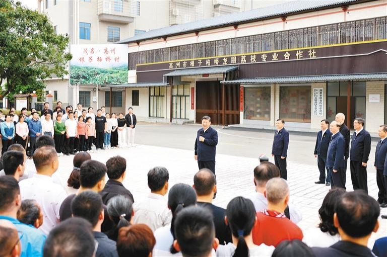 习近平11日来到茂名高州市根子镇柏桥村考察调研。柏桥村种植荔枝约6800亩,是荔枝生产专业村。习近平走进荔枝种植园,了解当地发展特色种植产业和文旅产业等情况,并同现场技术人员亲切交流。随后,习近平来到柏桥龙眼荔枝专业合作社,听取合作社运营和推进乡村振兴等情况介绍。习近平指出,这里是荔枝之乡,荔枝种植有历史传承和文化底蕴,特色鲜明,优势明显,市场空间广阔,要进一步提高种植、保鲜、加工等技术,把荔枝特色产业和特色文化旅游发展得更好。