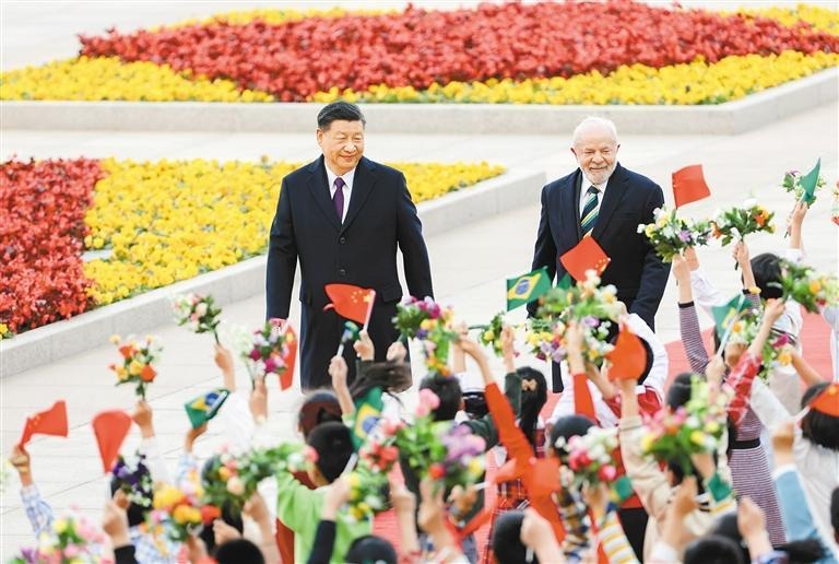 4月14日下午,国家主席习近平在北京人民大会堂同来华进行国事访问的巴西总统卢拉举行会谈。这是会谈前,习近平在人民大会堂东门外广场为卢拉举行欢迎仪式。