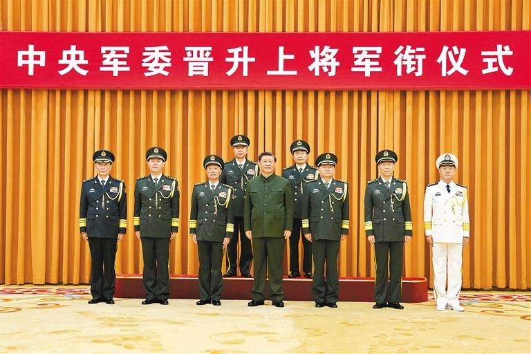 晋衔仪式在嘹亮的军歌声中结束。随后,习近平等领导同志同晋升上将军衔的军官合影。