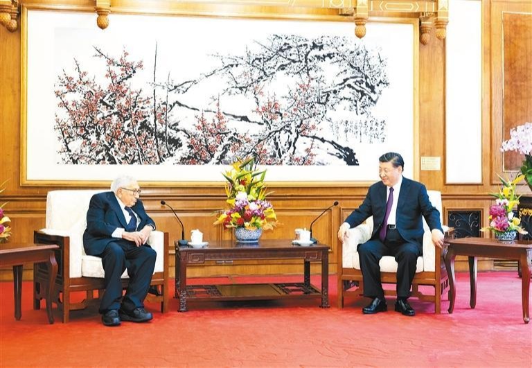 习近平指出,基辛格博士刚刚度过百岁生日,你访问中国已经一百多次。这两个“一百”加在一起,使你这次访华具有特殊意义。52年前,中美两国处在一个关键转折点,毛泽东主席、周恩来总理同尼克松总统和你本人以卓越的战略眼光,作出中美合作的正确抉择,开启了中美关系正常化进程,既造福了两国,也改变了世界。中国人重情讲义,我们不会忘记老朋友,不会忘记你为推动中美关系发展、增进中美两国人民友谊作出的历史性贡献。