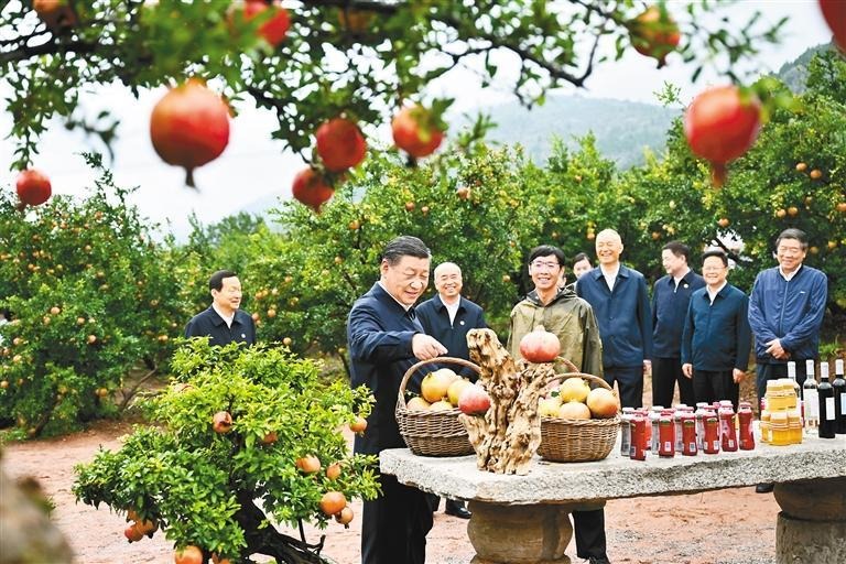 9月24日下午,在返京途中,习近平在山东省委书记林武和省长周乃翔陪同下来到枣庄市考察。枣庄是我国石榴集中连片种植面积最大、品种最多、产业链最完整的地区之一。习近平来到位于峄城区的冠世榴园石榴种质资源库,察看石榴树种,了解当地石榴种植历史、种质资源收集保存和产业发展情况,并来到石榴种植园中向老乡们询问今年石榴种植、收获和收入情况。得知当地大力发展石榴深加工和石榴盆栽培育有力带动了农民增收,习近平很高兴。他指出,人们生活水平在提高,优质特产市场需求在增长,石榴产业有发展潜力。要做好品牌、提升品质,延长产业链,增强产业市场竞争力和综合效益,带动更多乡亲共同致富。祝乡亲们生活像石榴果一样红红火火。