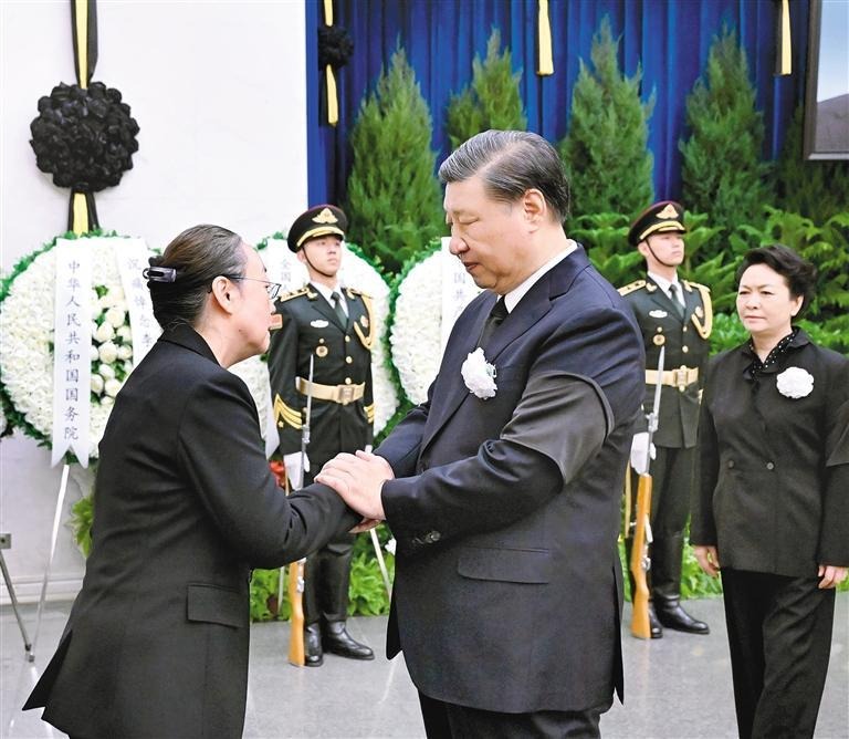 11月2日,李克强同志遗体在北京八宝山革命公墓火化。习近平、李强、赵乐际、王沪宁、蔡奇、丁薛祥、李希、韩正等前往八宝山送别,胡锦涛送花圈表示哀悼。这是习近平与李克强亲属握手,表示深切慰问。