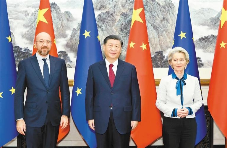 习近平强调,中国式现代化和欧洲一体化是中欧各自着眼未来作出的战略选择,中欧应该相互尊重,相互支持,加强发展战略对接,实现共同发展。共建“一带一路”倡议是开放平台,为世界上150多个国家和人民带来了实实在在的好处。赠人玫瑰,手有余香。中方愿继续推进高质量共建“一带一路”,包括同欧盟“全球门户”计划对接,一道帮助发展中国家加快发展。双方要在联合国、二十国集团等多边框架内加强沟通和协调,坚持多边主义,反对阵营对抗,推动政治解决国际和地区热点问题,就人工智能等事关人类未来的重大问题开展对话和合作,为增进全人类福祉、应对全球性挑战作出贡献。
