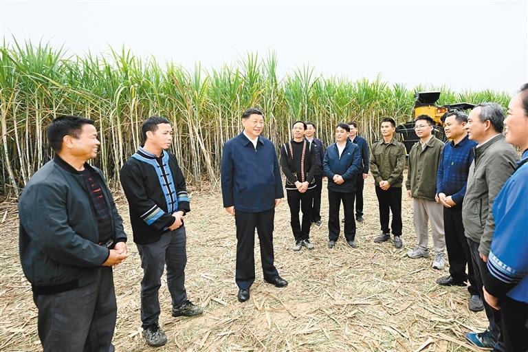 14日下午,习近平到来宾市考察调研。在国家现代农业产业园黄安优质“双高”糖料蔗基地,习近平察看万亩甘蔗林和机械化作业收割场景,听取基地情况介绍。他走进甘蔗林,详细了解甘蔗良种繁育技术要领,同蔗农、农机手和农技人员亲切交流。习近平指出,广西是我国蔗糖主产区,要把这一特色优势产业做强做大,为保障国家糖业安全、促进蔗农增收致富发挥更大作用。要积极培育和推广良种、提高机械化作业水平,建设好现代农业产业园。要探索建立更加稳定的利益联结机制,让广大农民共享农村改革和发展成果。他祝愿乡亲们的生活像甘蔗一样甜蜜。