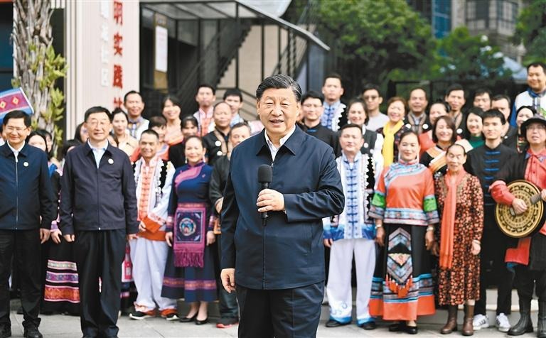 离开社区时,各族群众热情欢送总书记。习近平亲切地对大家说,我昨天结束对越南的国事访问,直接来广西考察调研。构建具有战略意义的中越命运共同体,将更有利于广西的开放发展,壮美广西前景光明。广西作为我国少数民族人口最多的自治区,各族人民同顶一片天、同耕一垌田、同饮一江水、同建一家园。全面建设社会主义现代化国家,一个民族都不能少。希望社区各族群众多来往,大家互帮互助,交知心朋友,做和睦邻居,共同建设幸福家园。