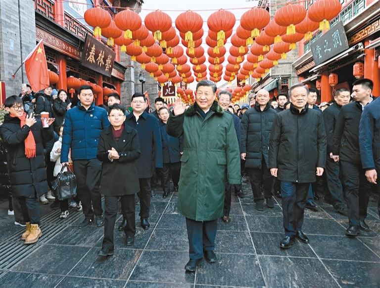 当天下午,习近平来到天津古文化街。街道古色古香,习近平沿街步行,先后走进桂发祥十八街麻花、果仁张、泥人张、杨柳青年画等特色店铺,了解产品种类、销售和传统文化传承发展等情况,同店铺业主、员工和现场群众互动交流。他说,各级党委和政府要加强节日期间民生商品的产销保供,确保数量充足、品类丰富、质量可靠,让广大群众放心消费、快乐过年。习近平指出,中国式现代化离不开优秀传统文化的继承和弘扬,天津是一座很有特色和韵味的城市,要保护和利用好历史文化街区,使其在现代化大都市建设中绽放异彩。