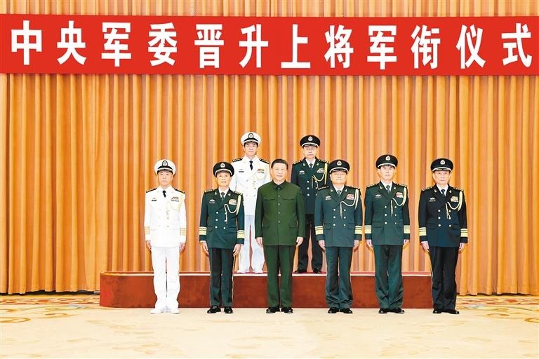 晋衔仪式在嘹亮的军歌声中结束。随后,习近平等领导同志同晋升上将军衔的军官合影。