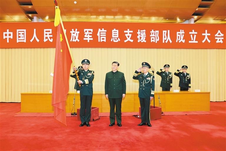 中国人民解放军信息支援部队成立大会19日在北京八一大楼隆重举行。中共中央总书记、国家主席、中央军委主席习近平向信息支援部队授予军旗并致训词,代表党中央和中央军委向信息支援部队全体官兵致以热烈祝贺。他强调,要贯彻新时代强军思想,贯彻新时代军事战略方针,坚持政治建军、改革强军、科技强军、人才强军、依法治军,聚焦备战打仗,按照体系融合、全域支撑的战略要求,锐意进取,扎实工作,努力建设一支强大的现代化信息支援部队。