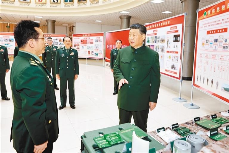 上午9时45分许,习近平来到陆军军医大学,首先了解大学基本情况和战场医疗救治重点学科情况,察看战伤急救器材和学员操作演示。陆军军医大学有着光荣历史传承,在长期办学实践中形成了高原军事医学、战创伤医学、烧伤医学等鲜明特色和优势。2017年调整组建以来,大学坚持姓军为战,推进创新发展,出色完成军事斗争卫勤保障、新冠疫情防控等一系列重大任务。习近平对陆军军医大学建设和完成任务情况给予肯定。