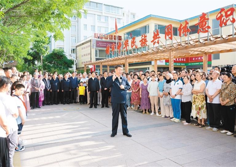 傍晚时分,社区广场十分热闹,居民们看见总书记来了,纷纷围拢过来,热烈鼓掌欢迎。习近平亲切地对大家说,时隔4年,我再次来宁夏看望各族干部群众,见到大家非常高兴!中华民族是一个大家庭,各族人民要像石榴籽一样紧紧抱在一起。要不断铸牢中华民族共同体意识,把各族人民的心紧紧连在一起,把各方面的力量广泛凝聚到一起,共同推进中国式现代化,共襄中华民族伟大复兴的盛举。